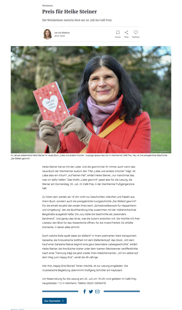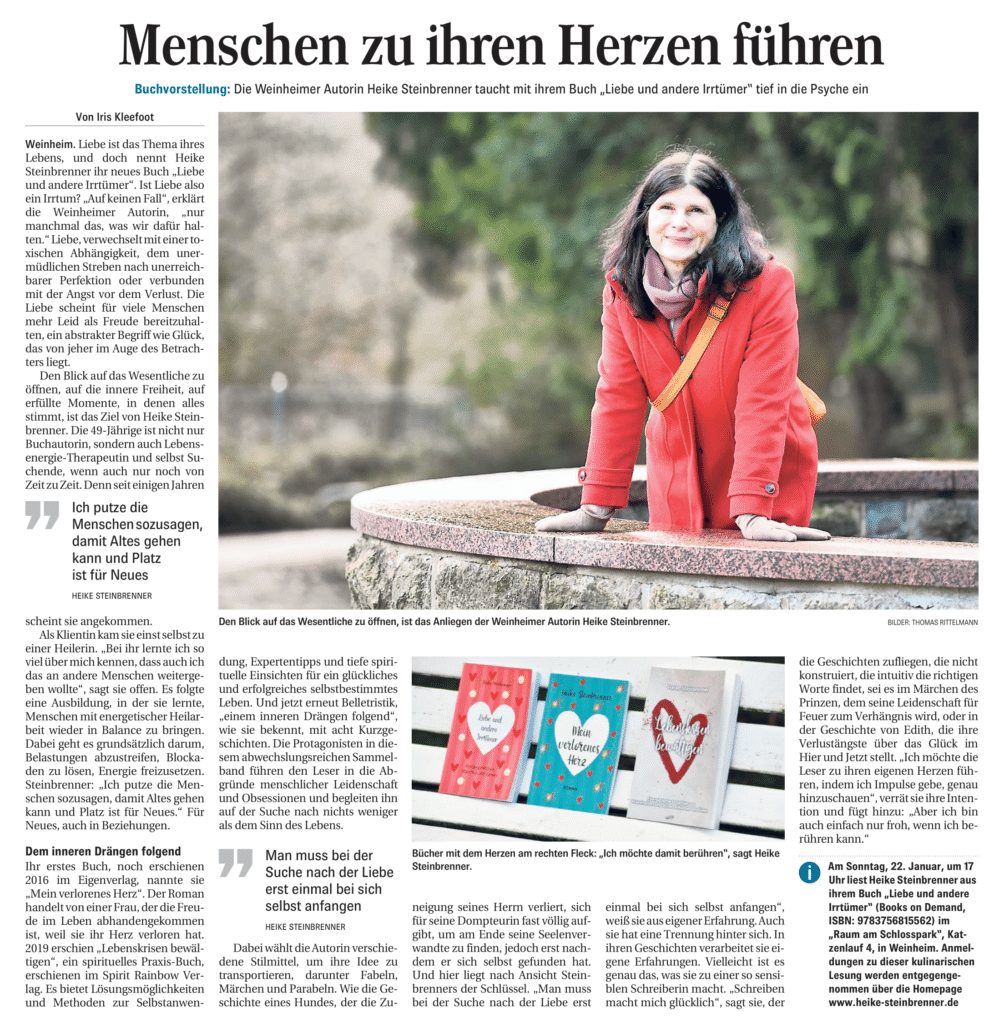Seit 2022 gebe ich Lesungen in der näheren Umgebung von Weinheim/ Heidelberg. Hier verbinde ich meine Leidenschaft für Sprache, Ausdruck und Literatur.